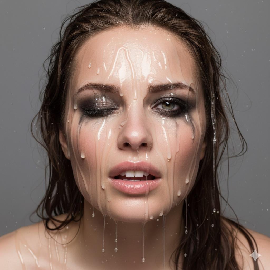プロンプト: きれいな白人女性の顔を上から見たクローズアップ。彼女は視聴者を見上げています。彼女の頭上から、白濁した透明で粘っこい液体の滴が彼女の額、頬、唇、そして鼻の横に当たりました。ドリップの量はそれぞれ大さじ半分程度です。閉じた片方の目に点滴が入ってしまう。顔に当たる水滴に少し驚いているが、不快ではない。実際、彼女はその感触がとても気に入っています。彼女のアイメイクは少し崩れていて、疲れたように見えます。彼女は口で呼吸しています。彼女の髪はボサボサで、液体によって髪がくっついている場所がいくつかあり、わずかにつや消しになっています。彼女の髪の一部が濡れた汚れで顔にくっついている